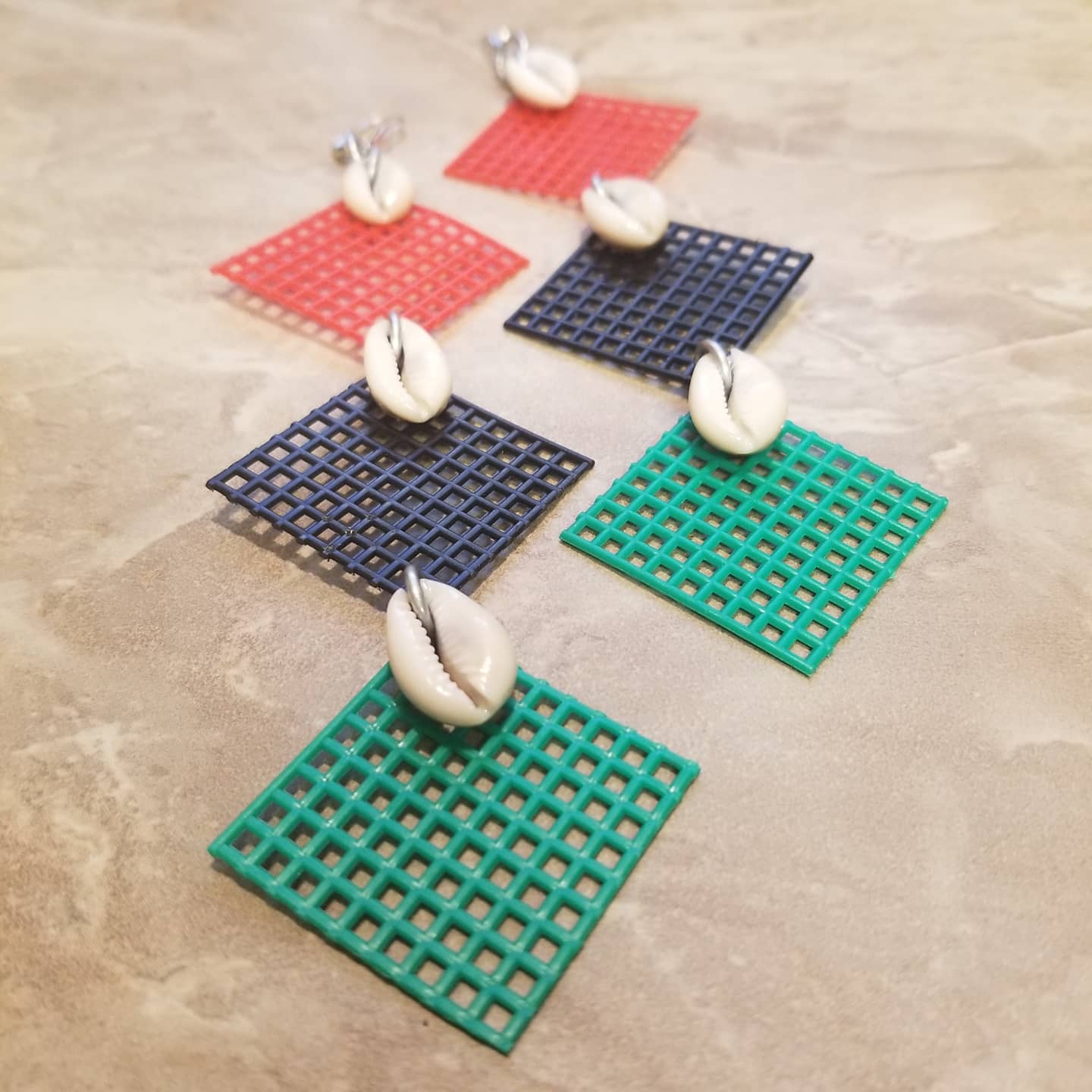Red, black, and green earrings with plastic canvas triangles and natural cowrie shells.