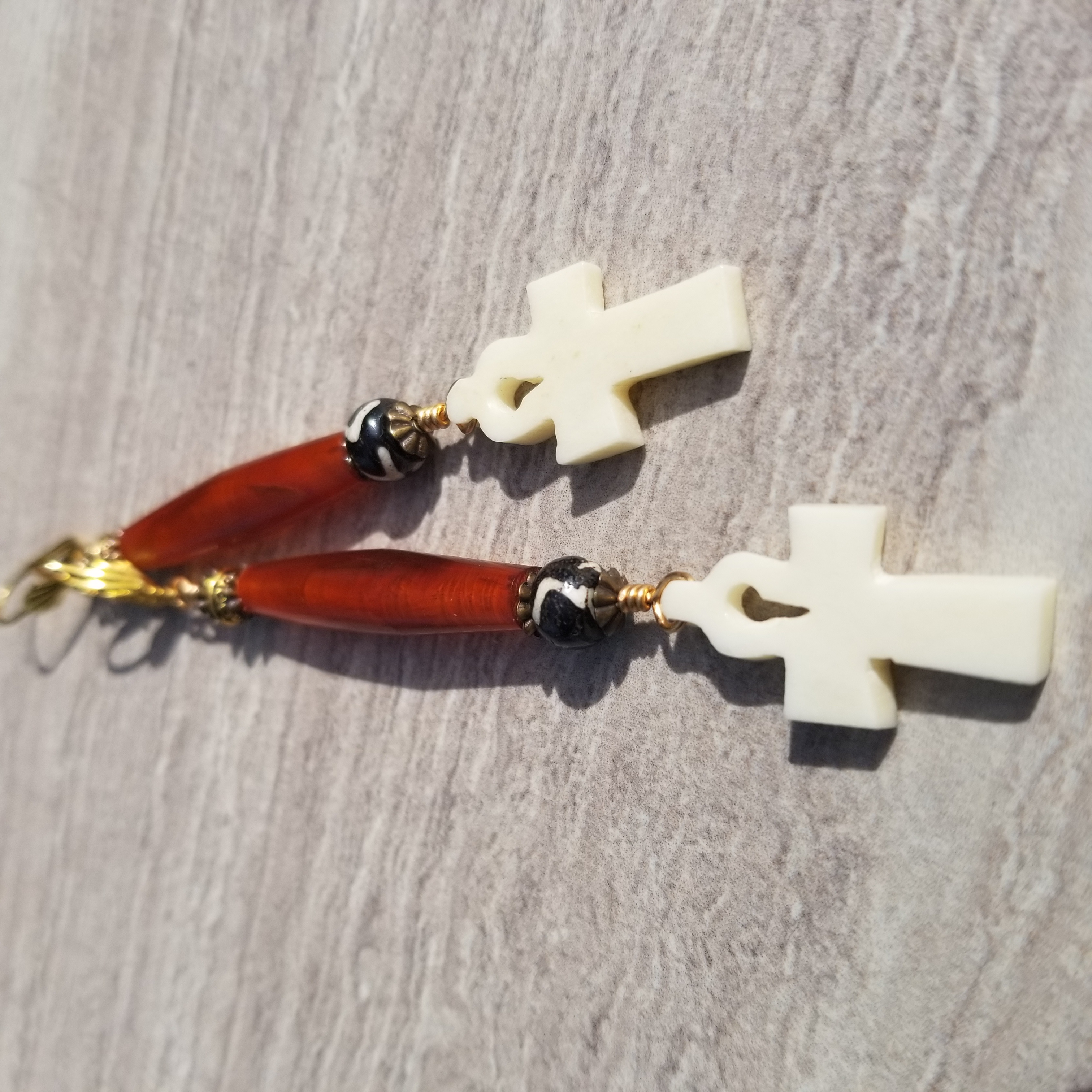 These lightweight dangle earrings are made with bone, horn, and gold-plated/finished details.