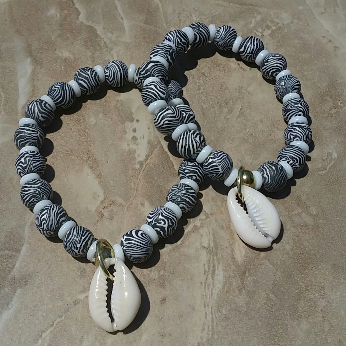 Clay, glass, and brass bracelet with natural cowrie shell dangle. Available in two sizes: medium and large female adult.