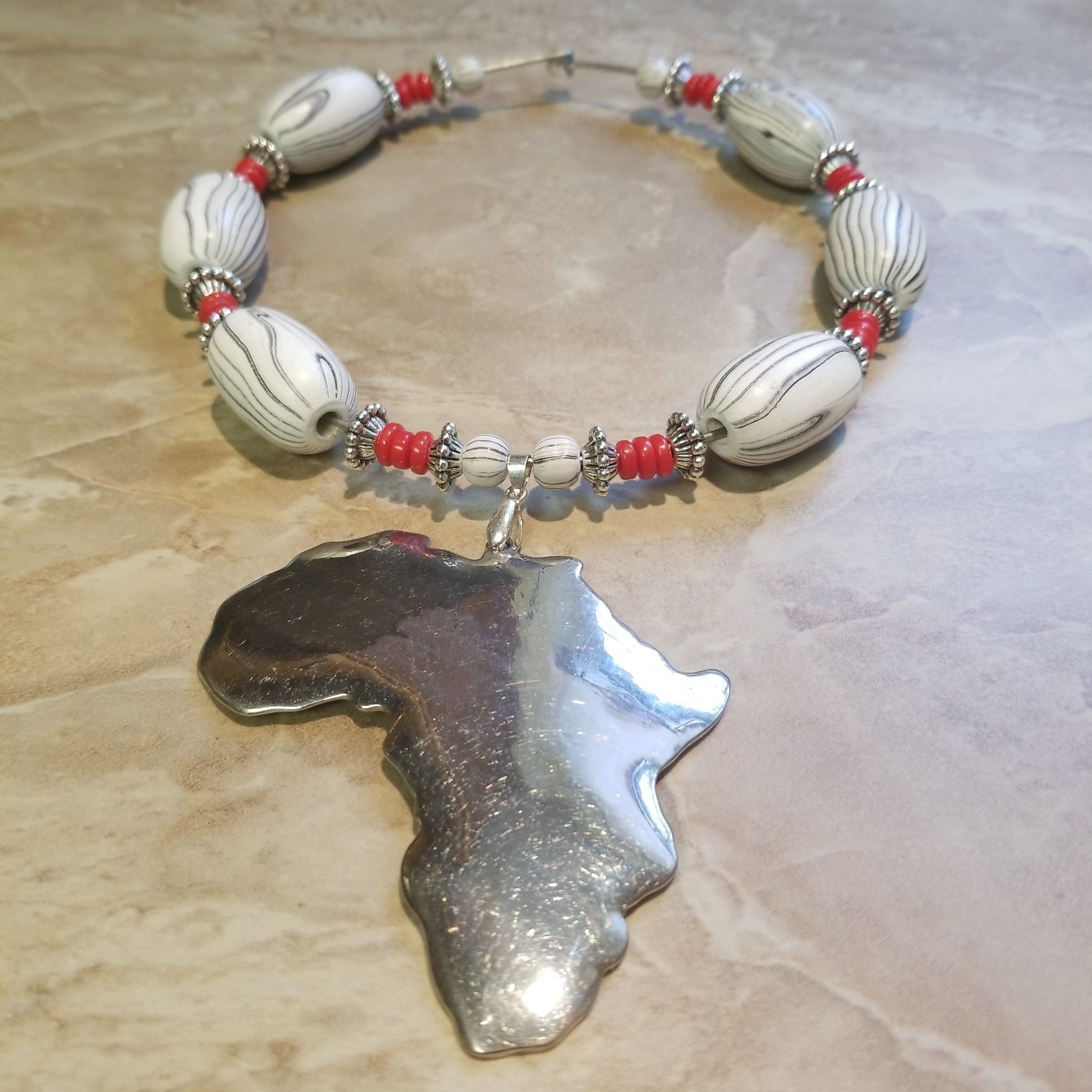Silver-plated African choker with wooden, glass, and silver-plated/finished beads.