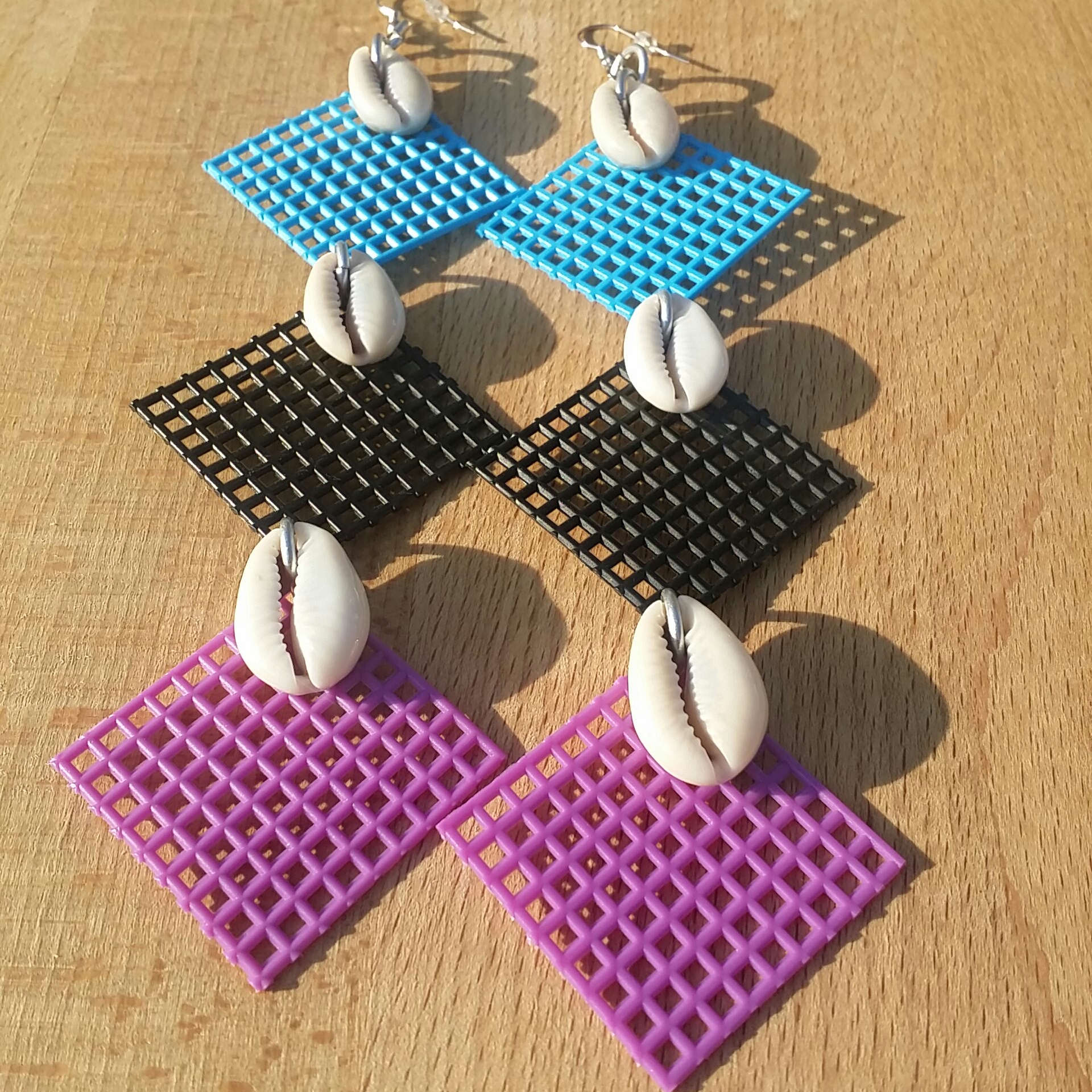 Lightweight plastic canvas earrings with natural cowries and silver-tone details.