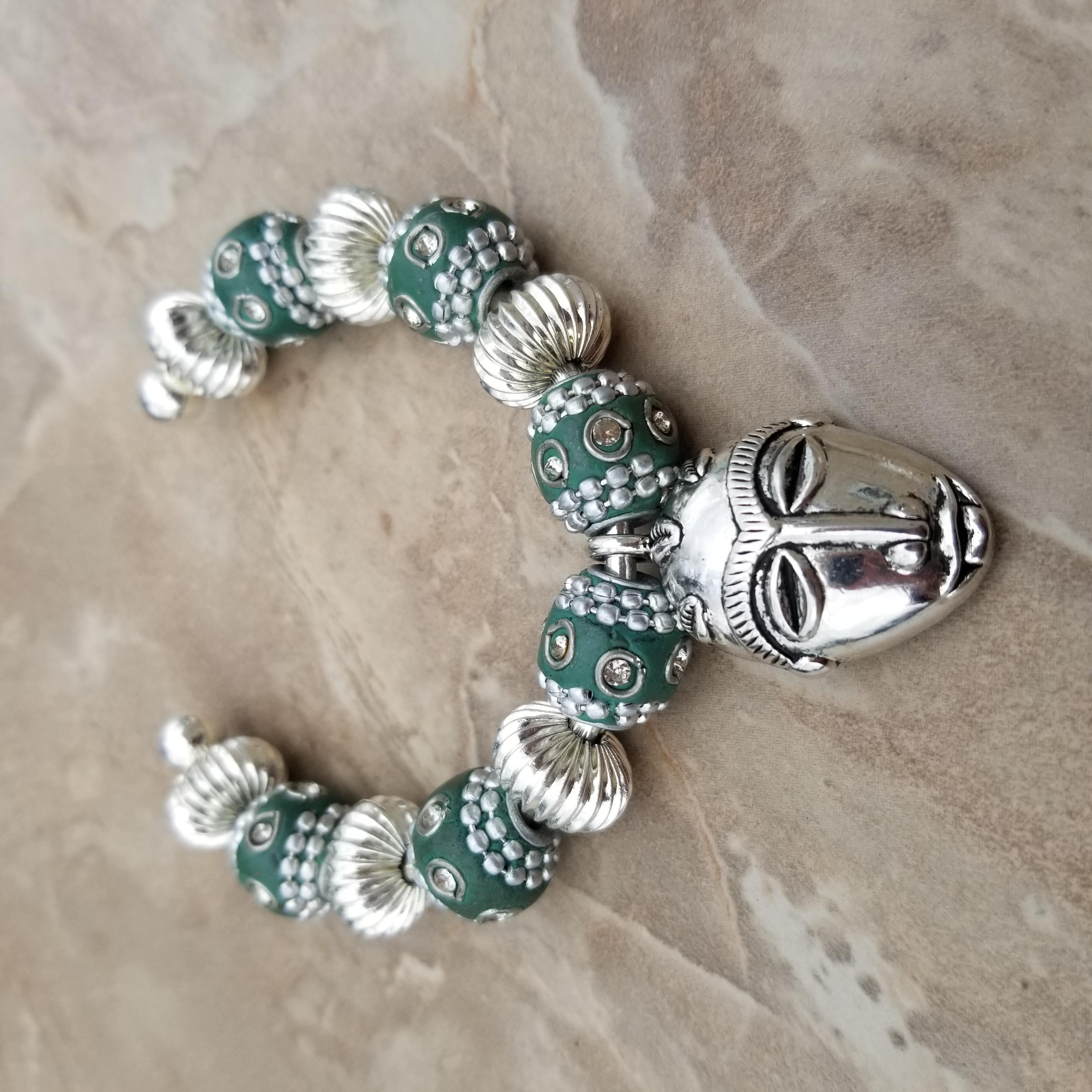 Silver-plated/finished adjustable bangle bracelet is decorated with decorative beads and silver-plated/finished African mask charm.