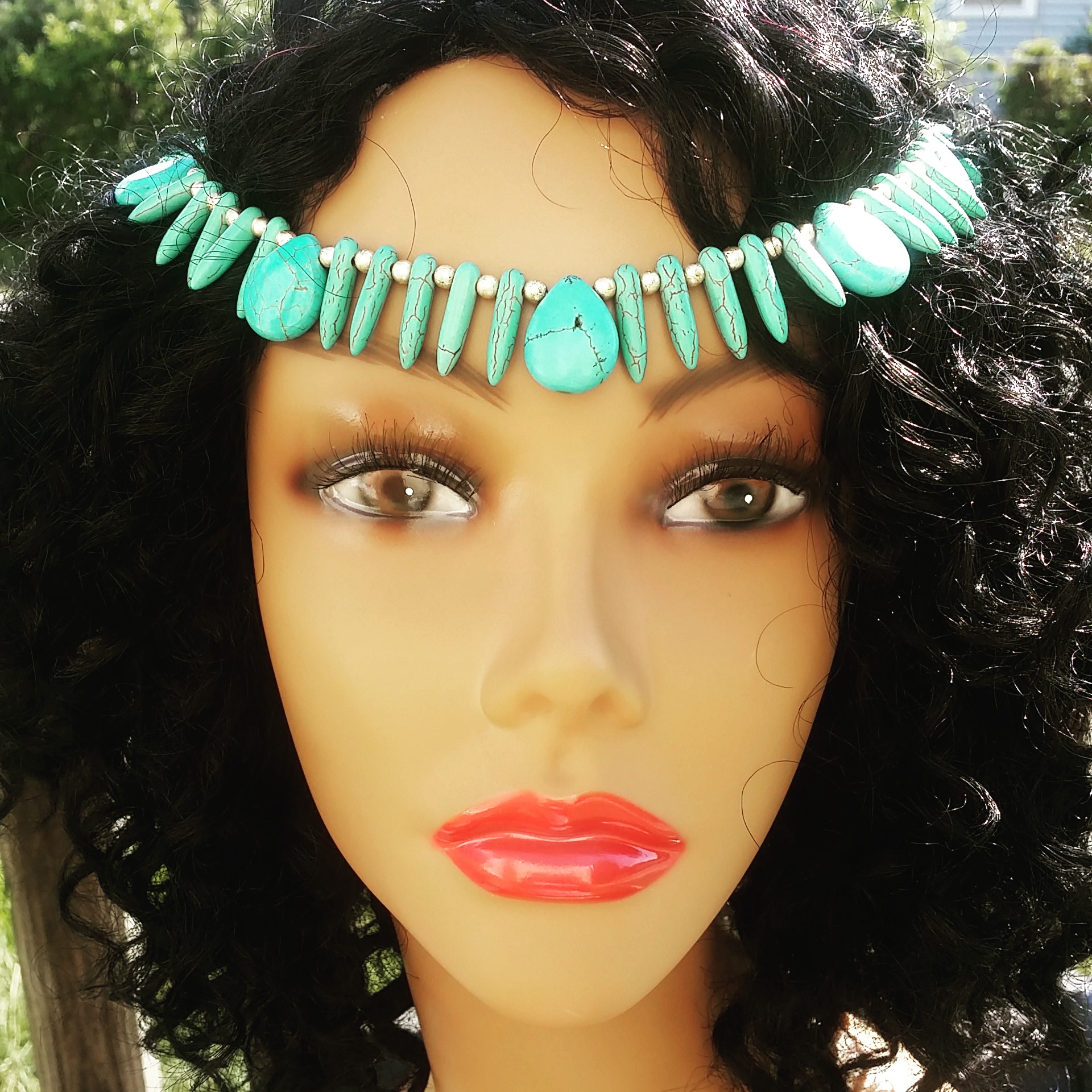 Turquoise beaded head crown (for those with dark hair) with spikes and gold-plated, satin-finished beads.