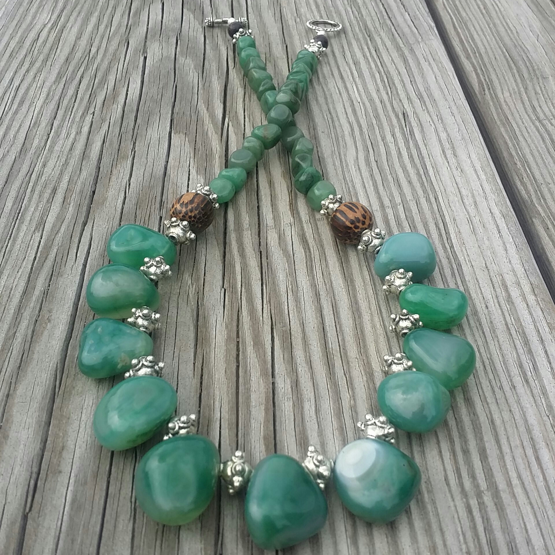 Green Agate necklace with Tiger Kamagong wood and silver-plated details.