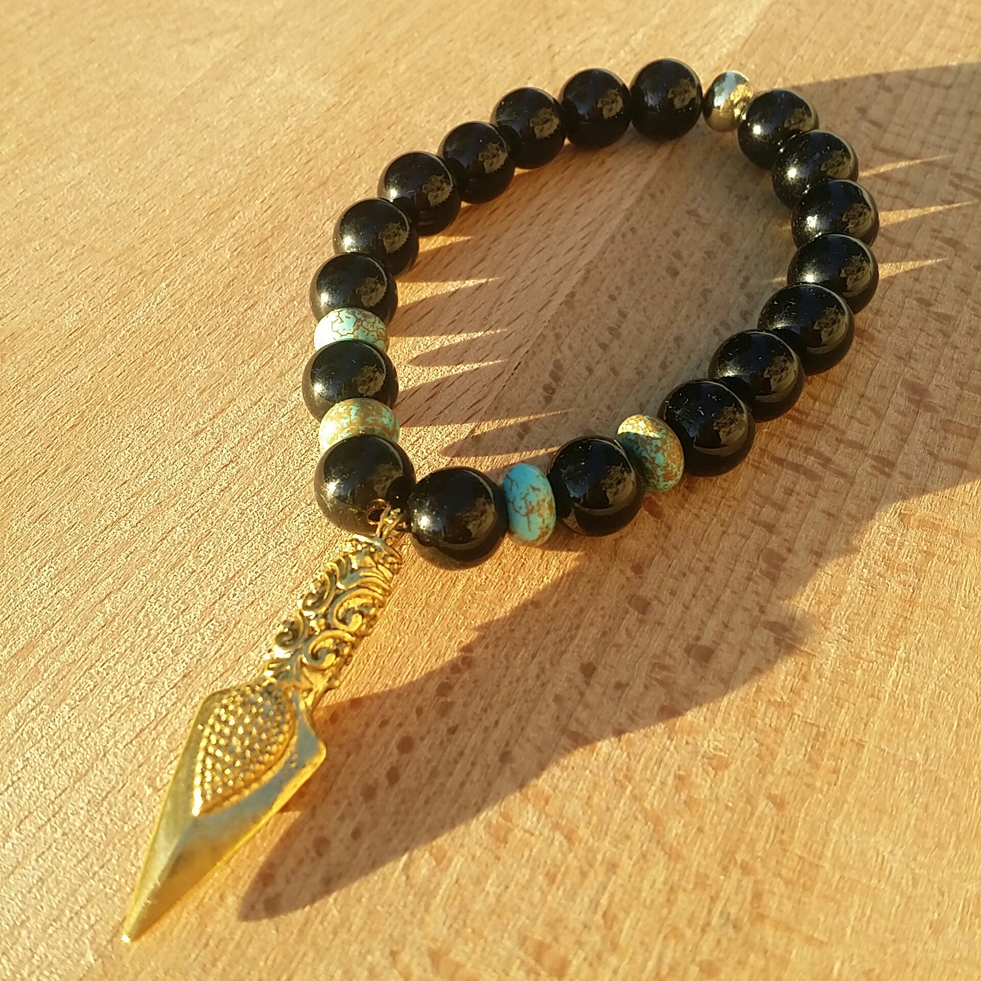 Amulet/protection stretch bracelet with howlite turquoise, black glass, and gold-plated beads.