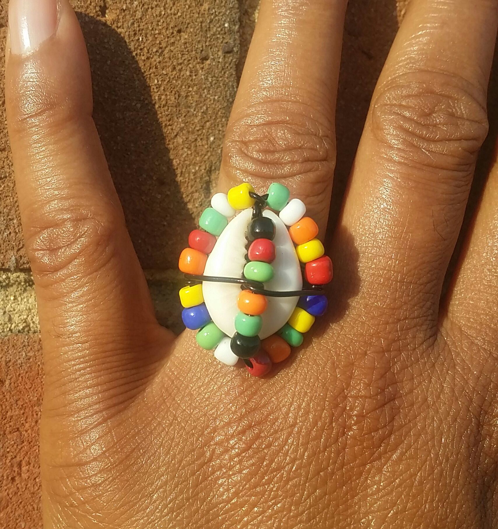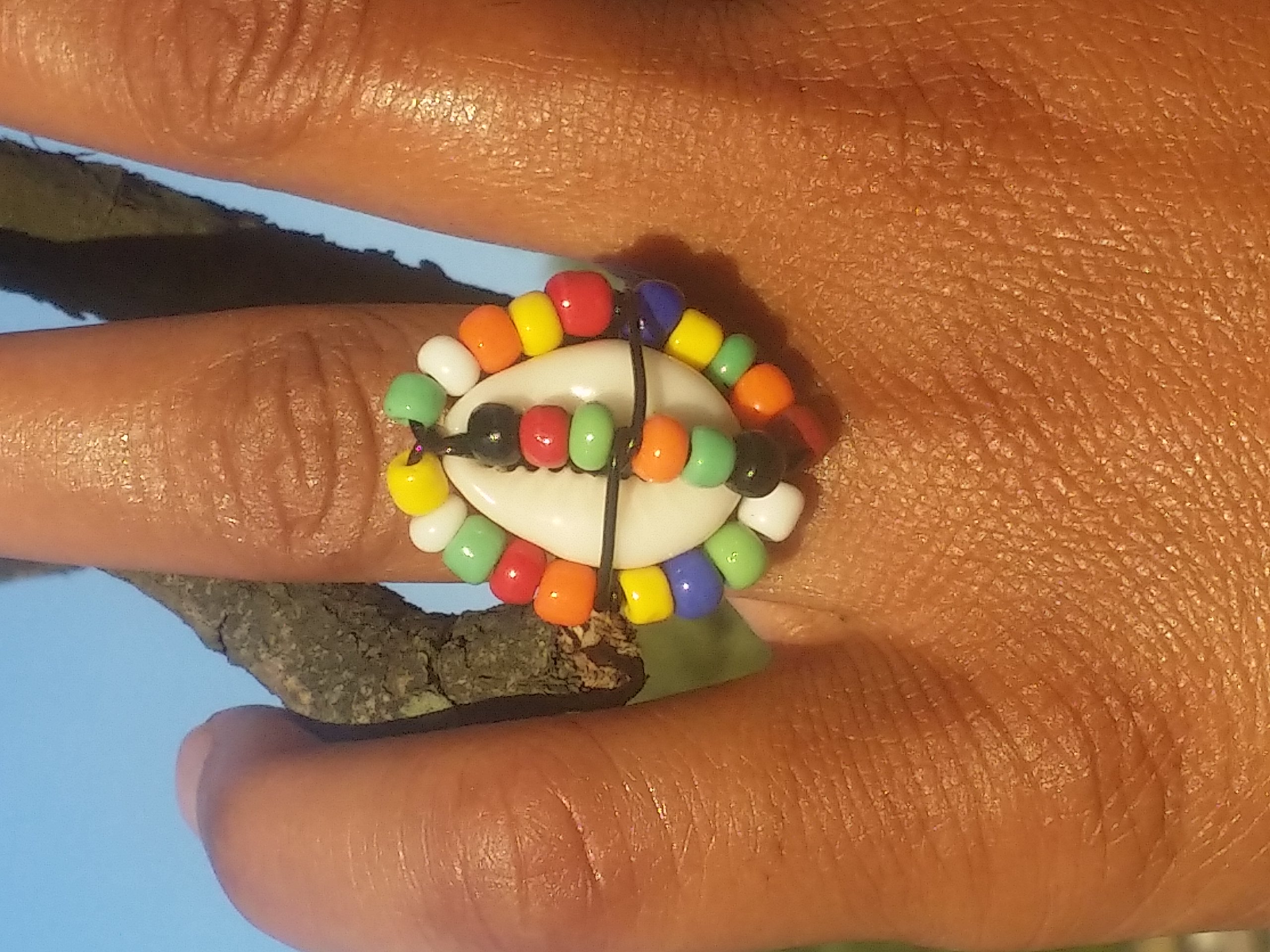 Cowrie ring encased with colorful seed beads on black craft wire with copper core. Size 7.