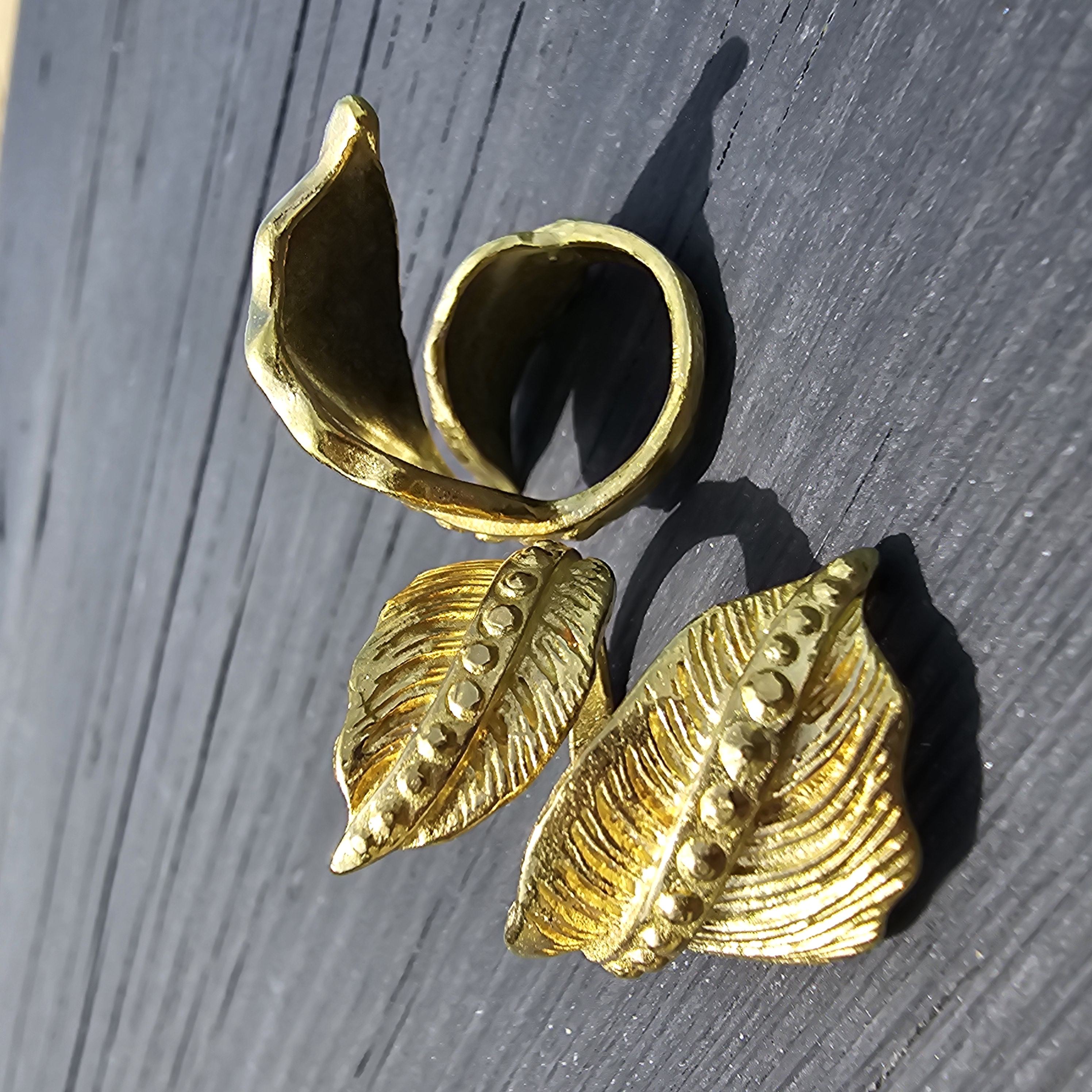 Brass leaf ring accentuates every finger. One size fits most.