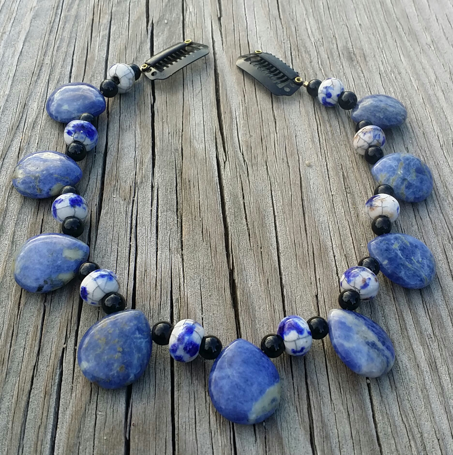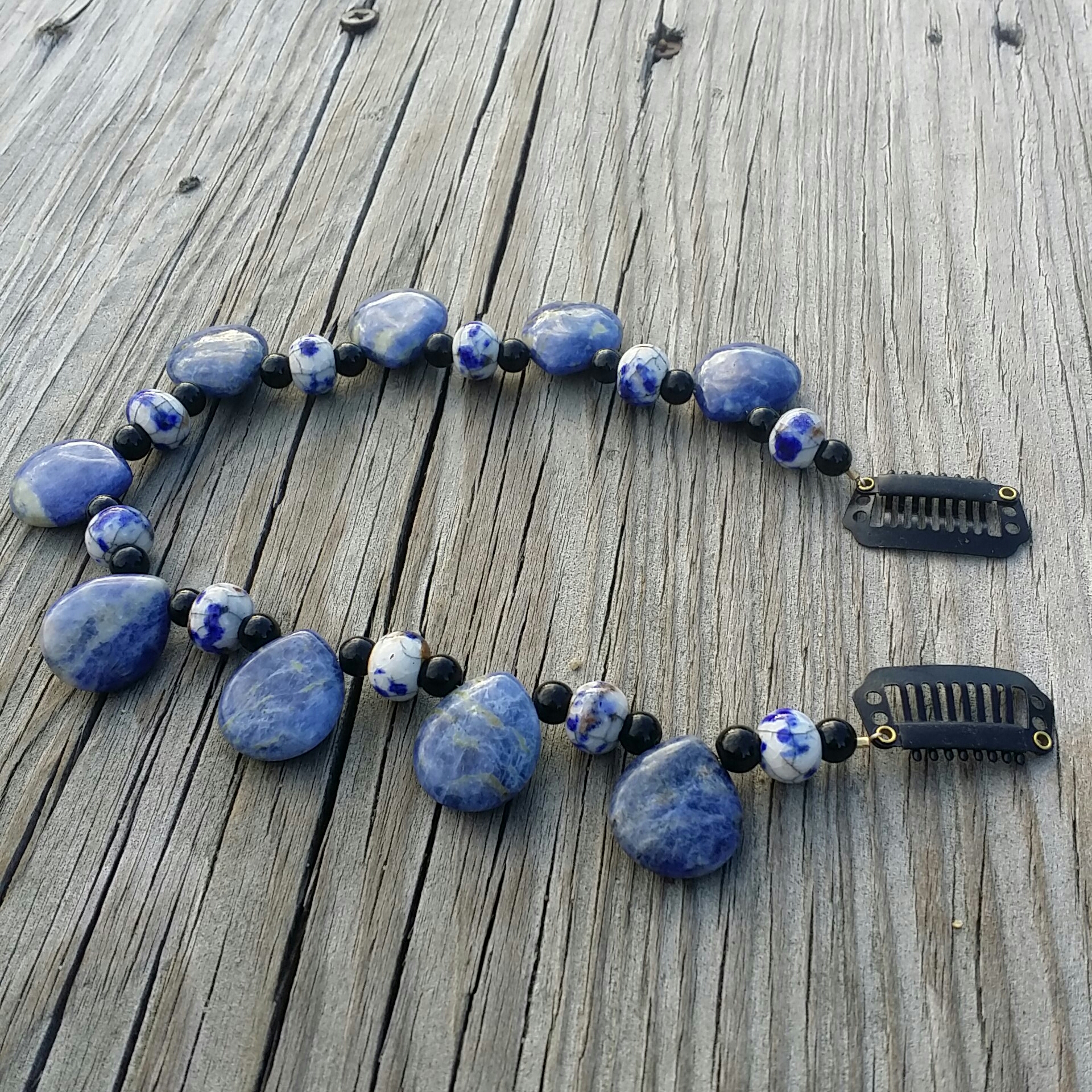 Sodalite gemstone and ceramic bead head crown/necklace with two black wig clips perfect for dark hair.