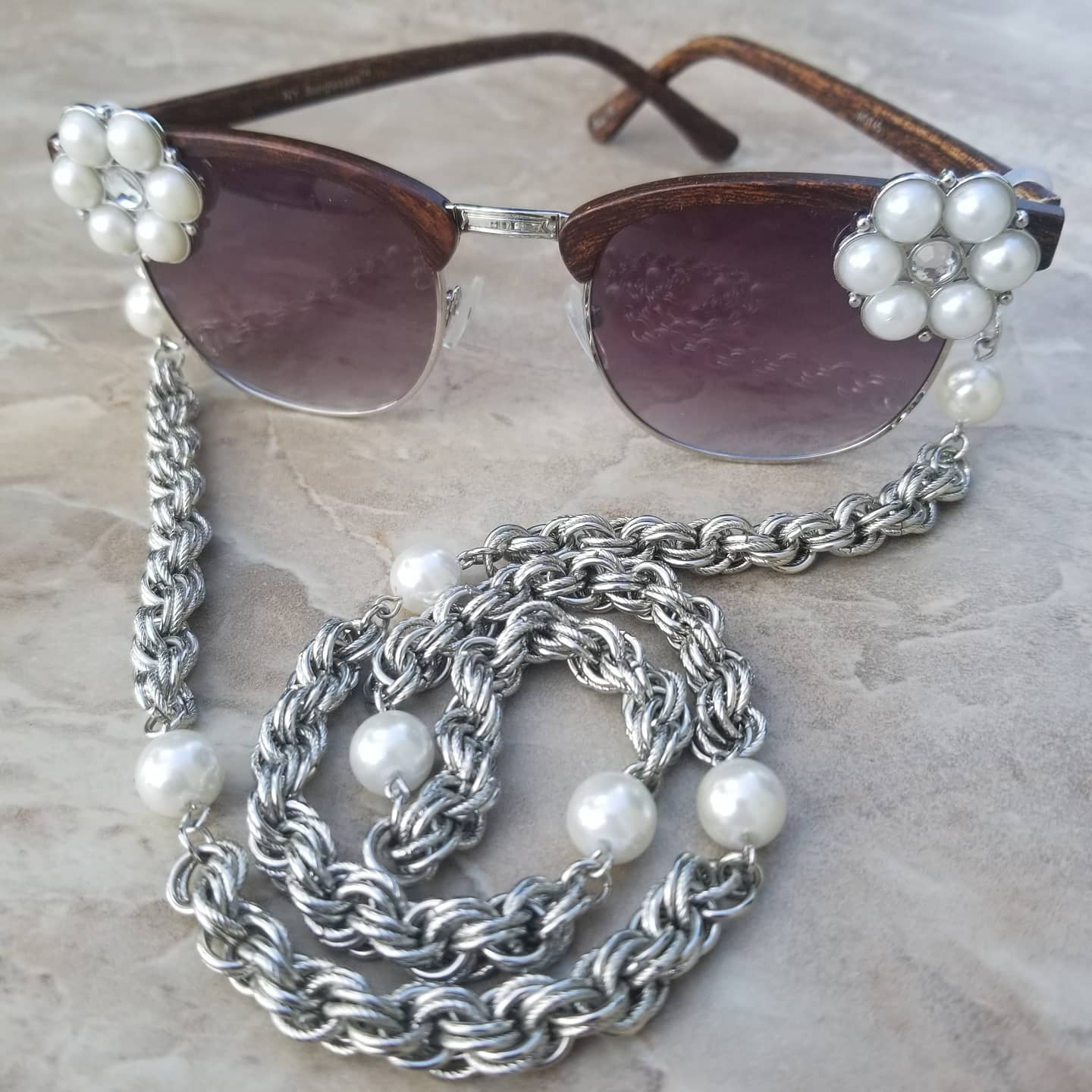 Gorgeous faux wood sunglasses are decorated with faux pearl accents and up-cycled decorative silver-plated/finished removable eyewear chain.