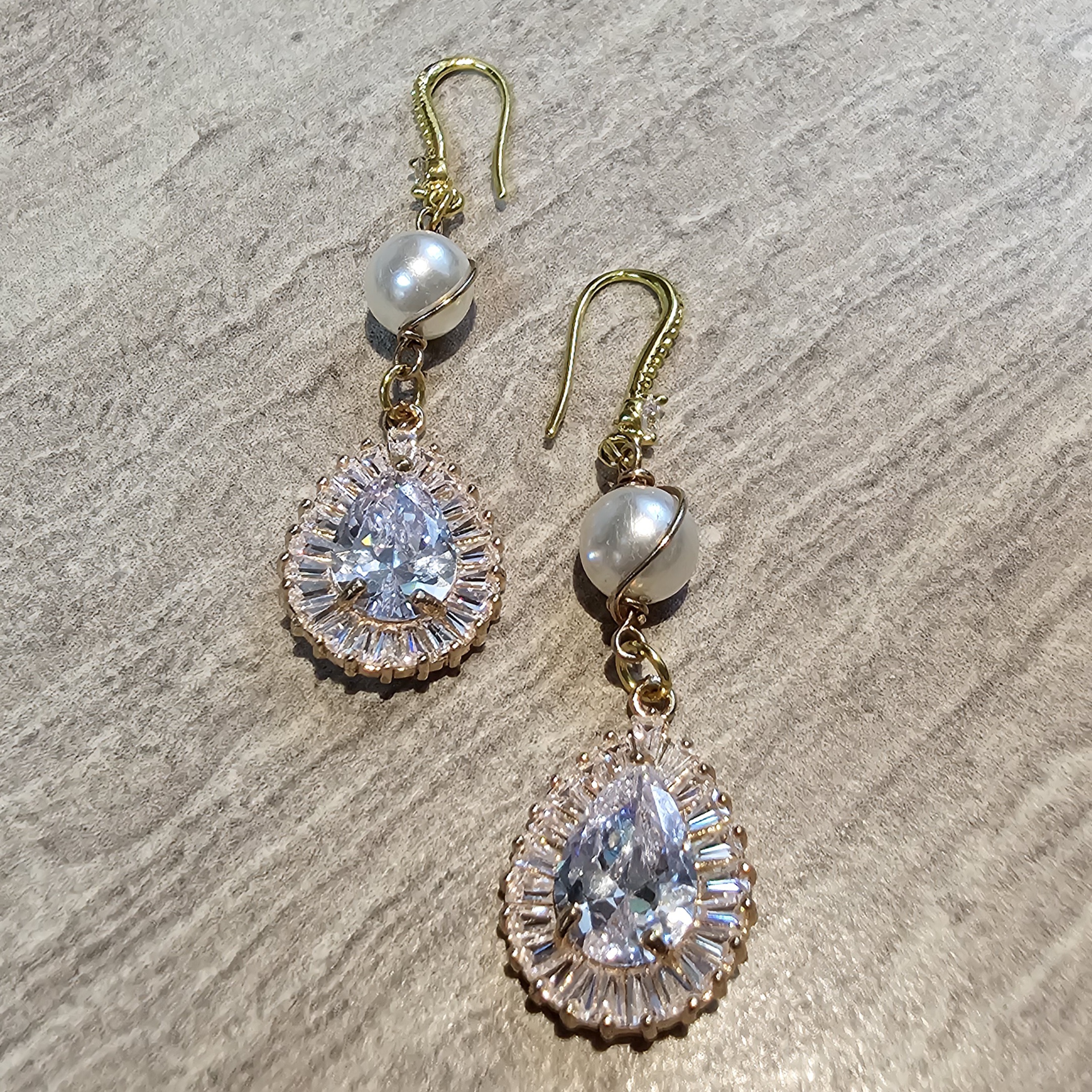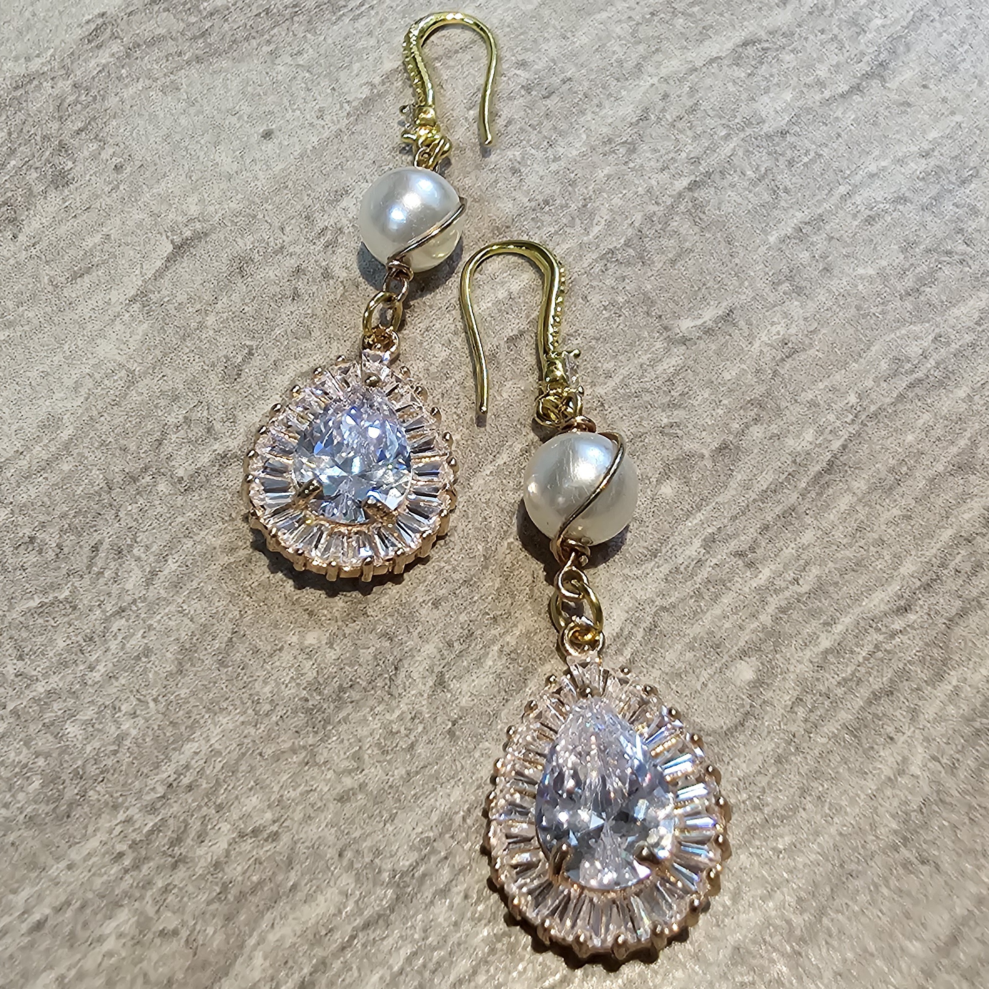 These are formal/dressy earrings with ornate earwires, wire-wrapped pearls, and teardrop sparkle charms.