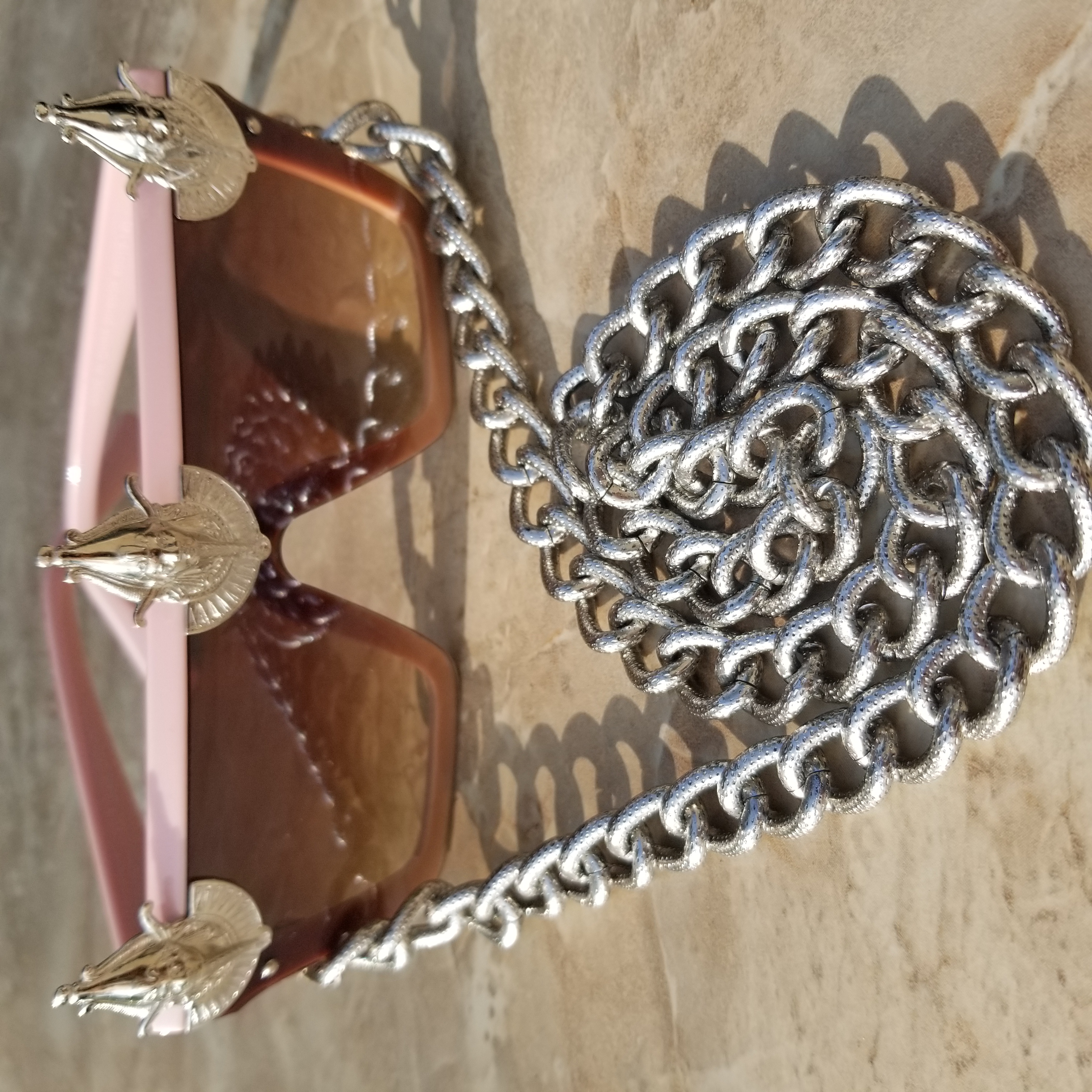 Colorful sunglasses are decorated with silver-plated/finished pharaoh stampings and bold removable eyewear chain.