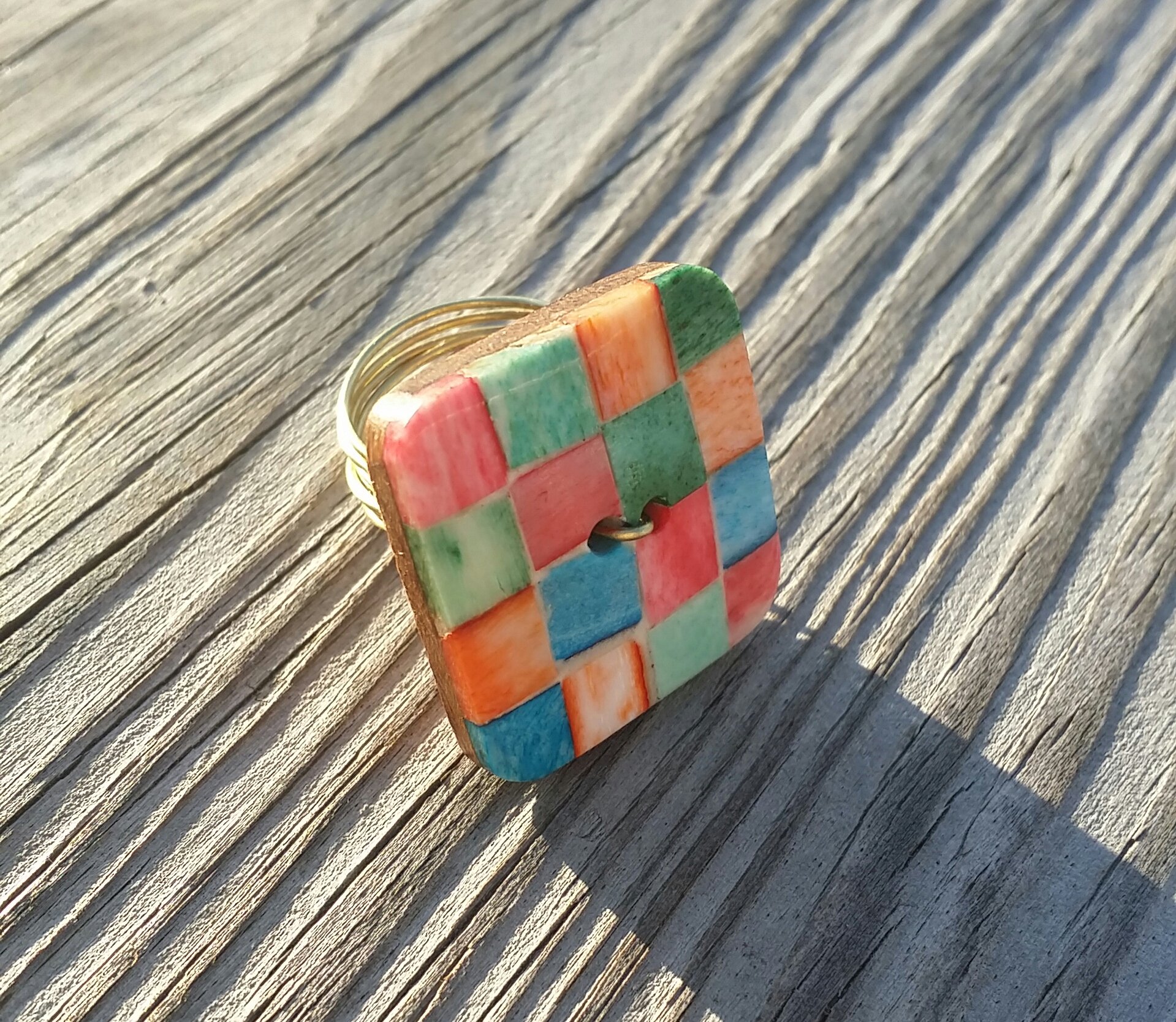 Bone button ring made with brass wire treated with non-tarnish coating. Made to order; so, please specify ring size.
