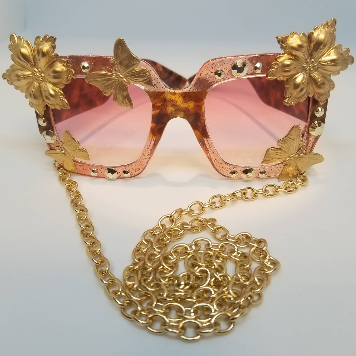 Statement glasses are decorated with brass stampings, jewel appliques, and removable gold-plated/finished eyewear chain.