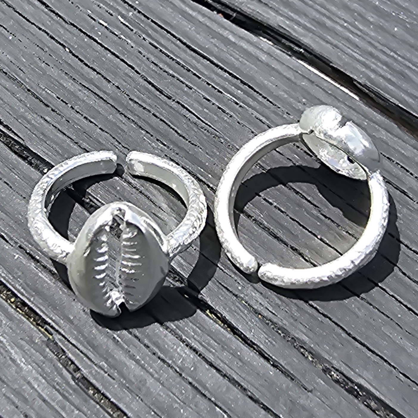 Silver-plated/finished brass cowrie ring is fully adjustable. One size fits most.