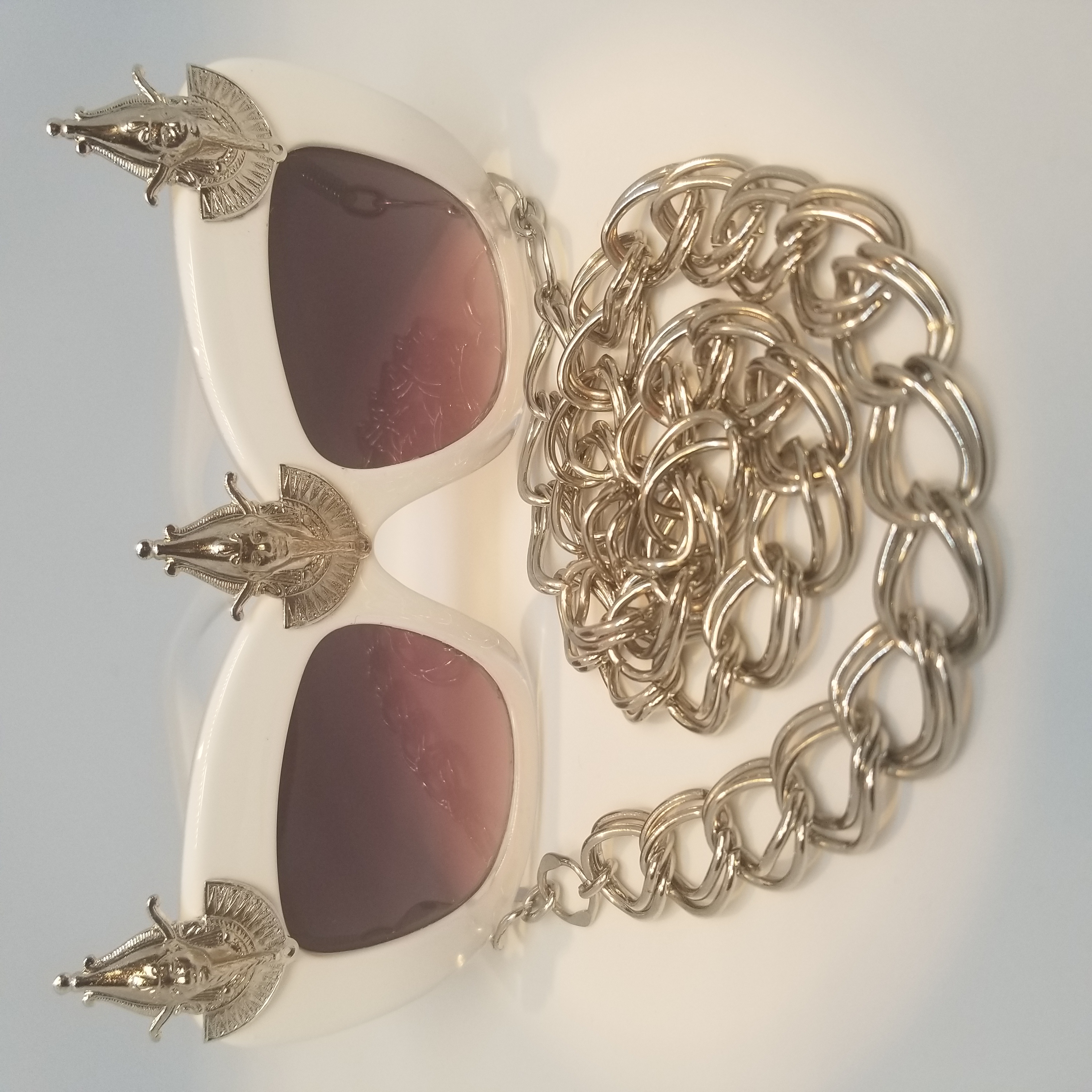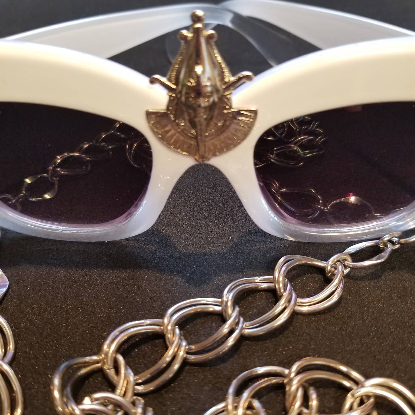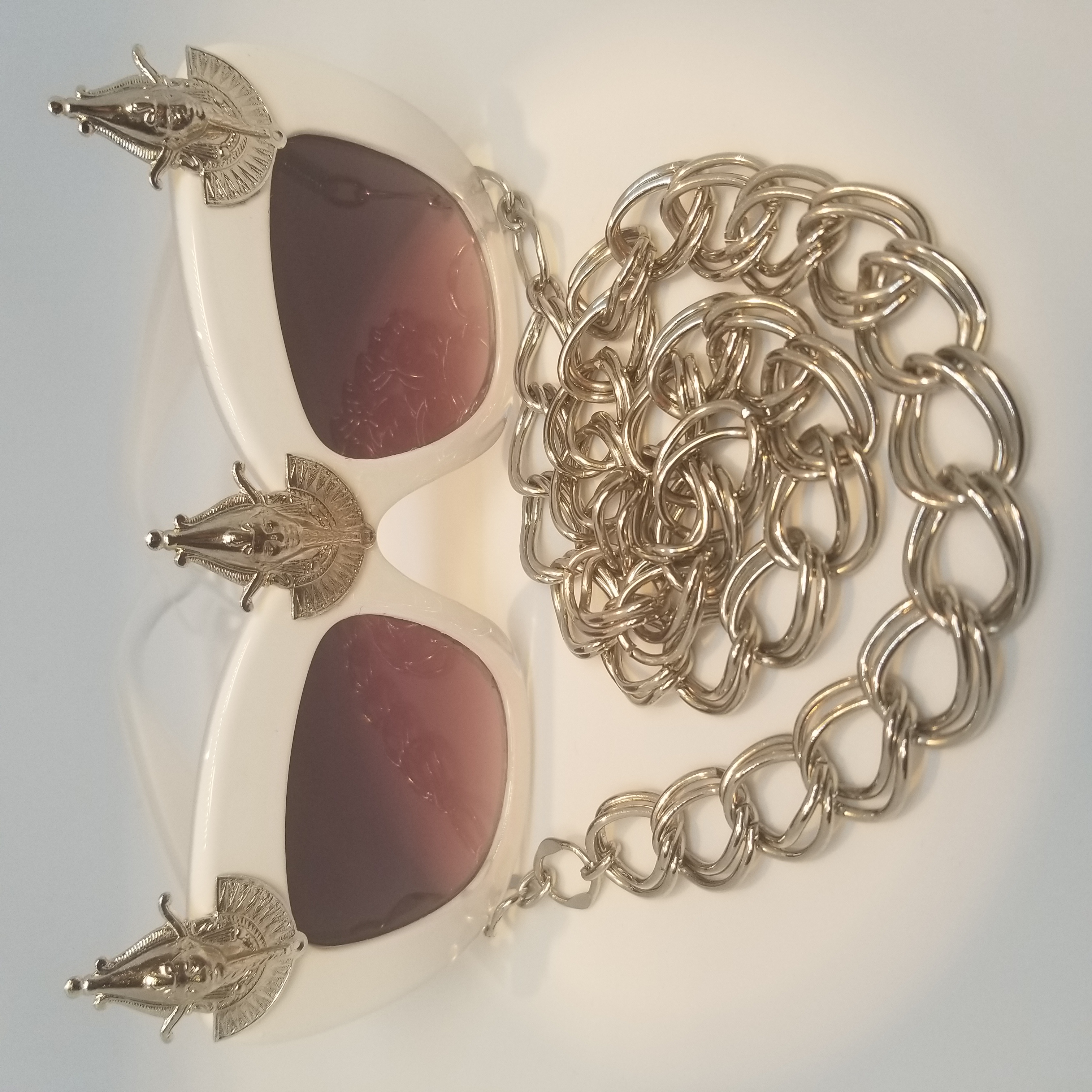 Gorgeous sunglasses are decorated with silver-plated/finished pharaoh stampings and decorative eyewear chain.
