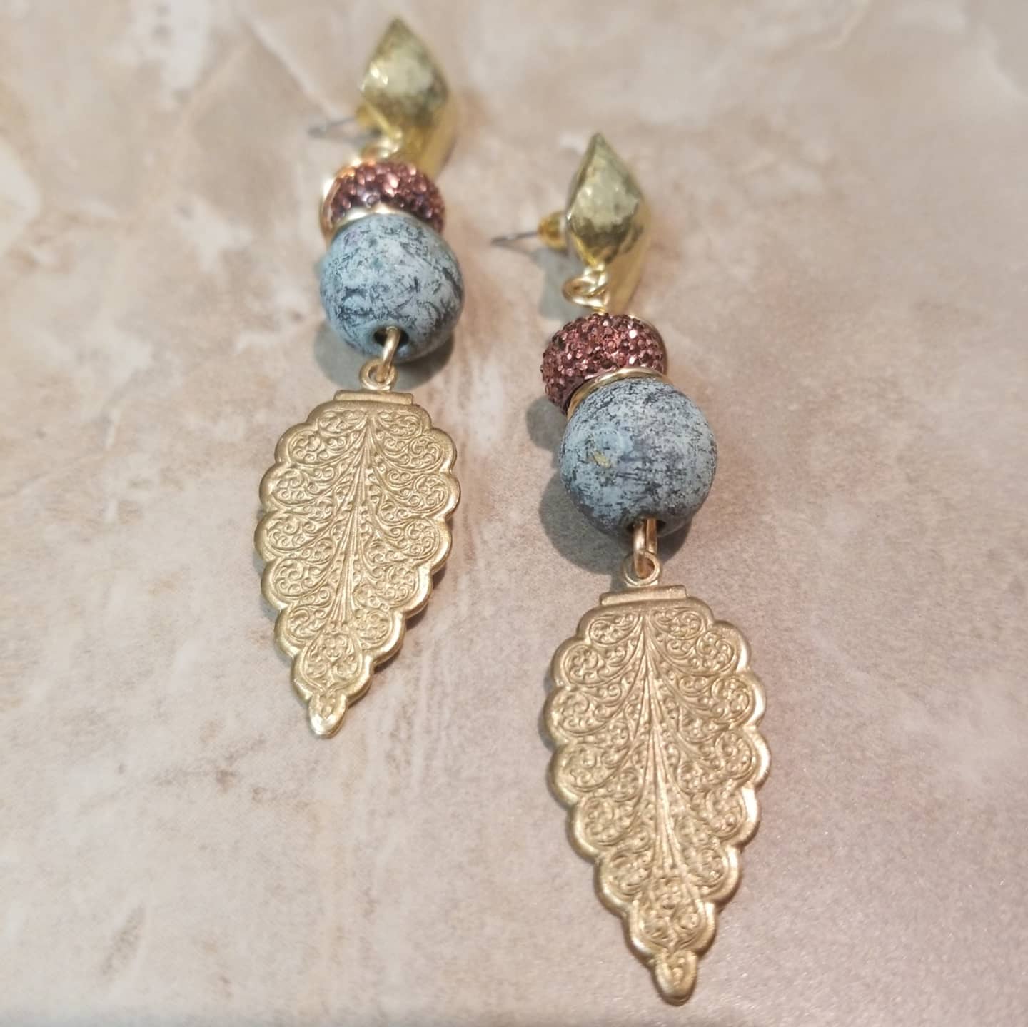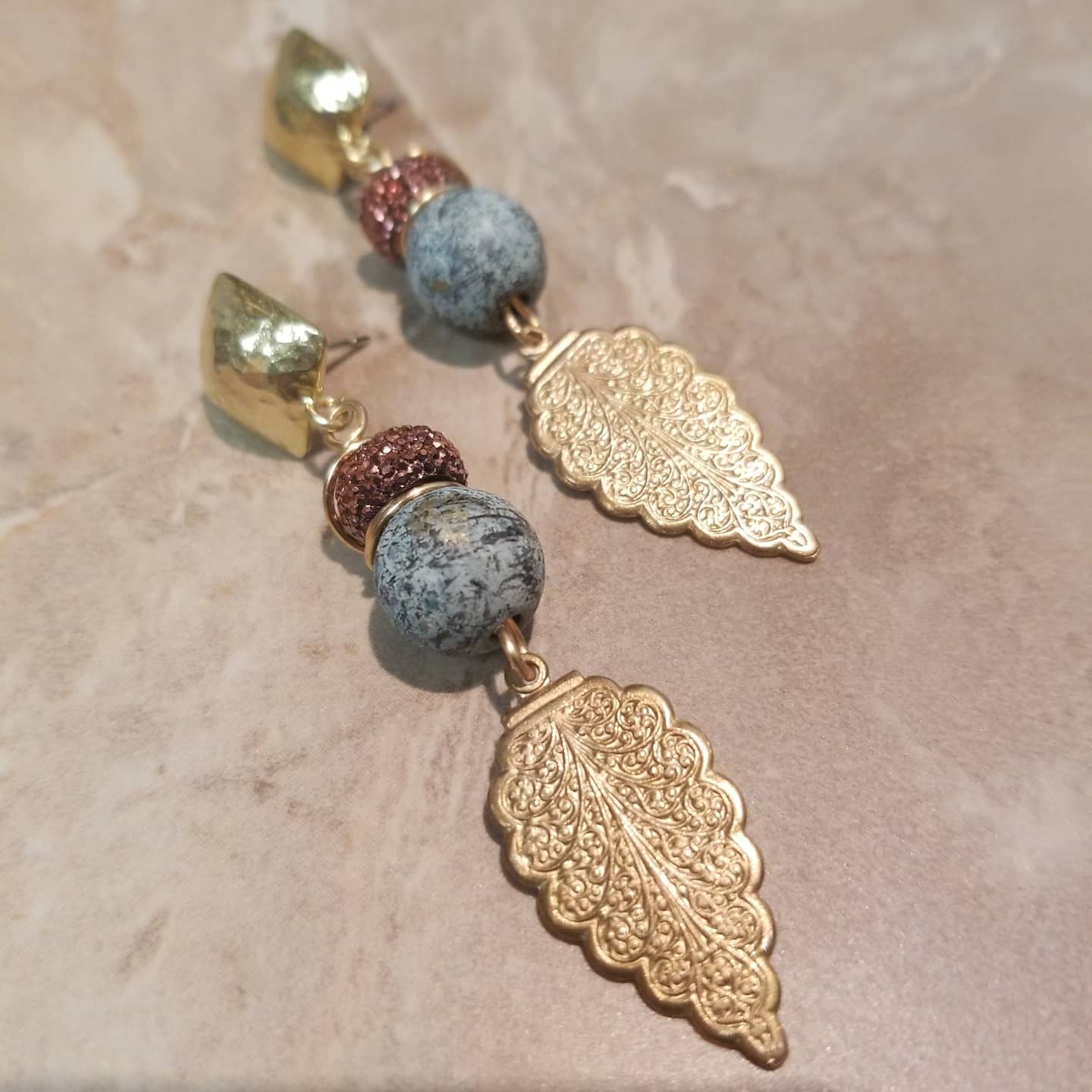 Brass dangle post drop earrings with decorative beads (patina brass and sparkle resin) are truly FANCY.