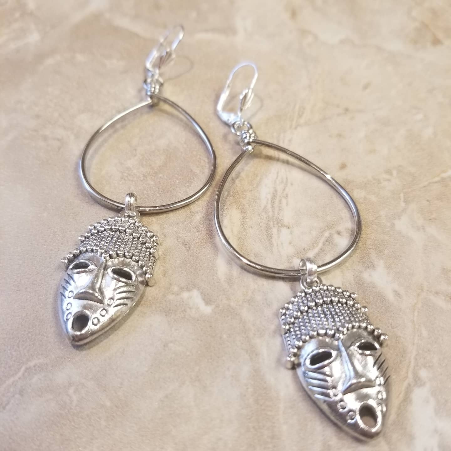 Silver-plated/finished teardrop hoop earrings are adorned with African mask charms and leverback earwires.