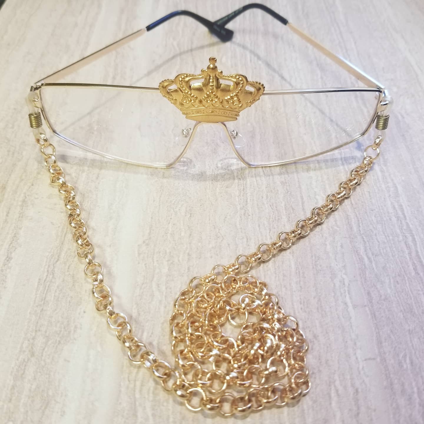 Clear Sunday are decorated with brass crown and removable eyewear chain.