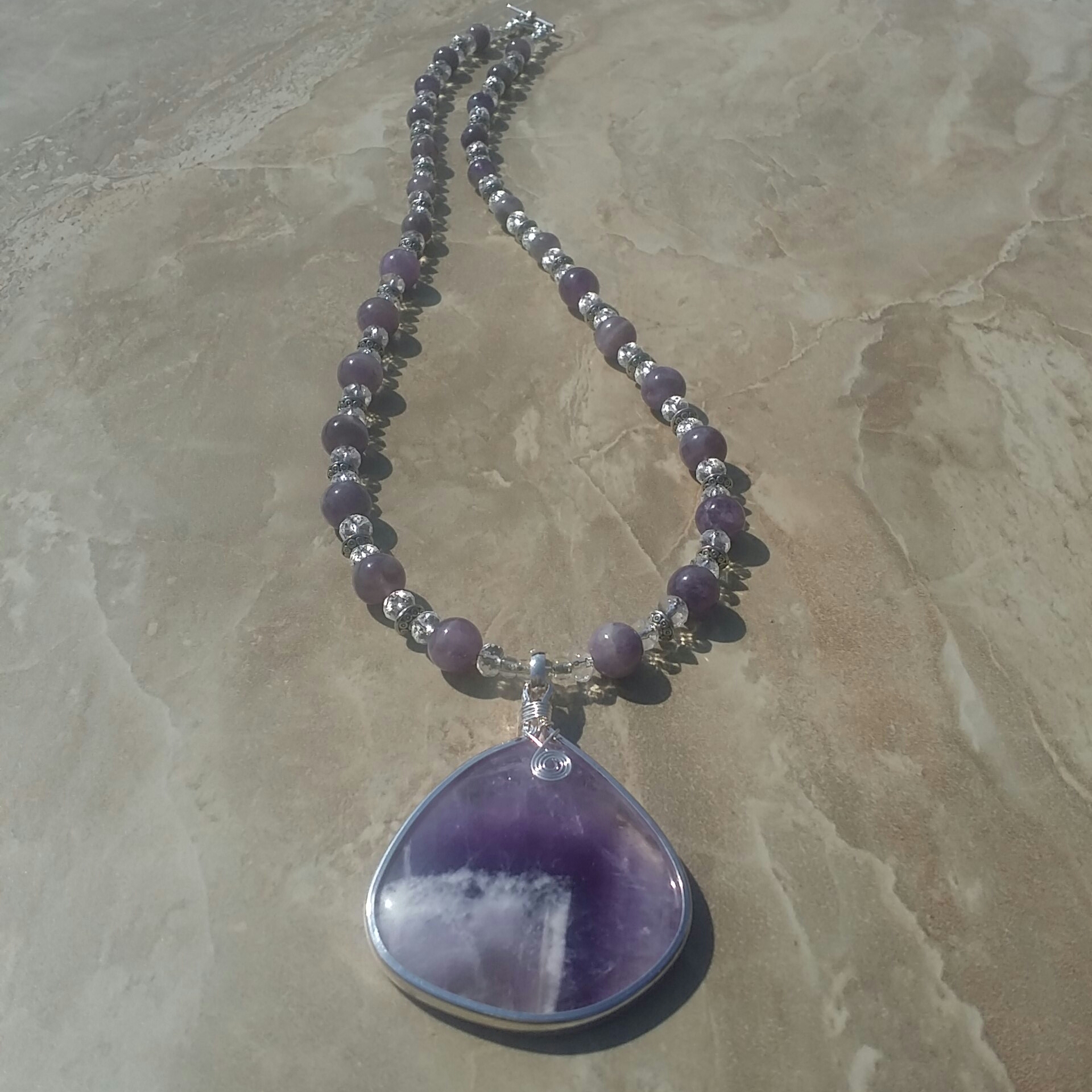 Amethyst pendant necklace with amethyst beads, crystal glass, and silver-plated metal beads.