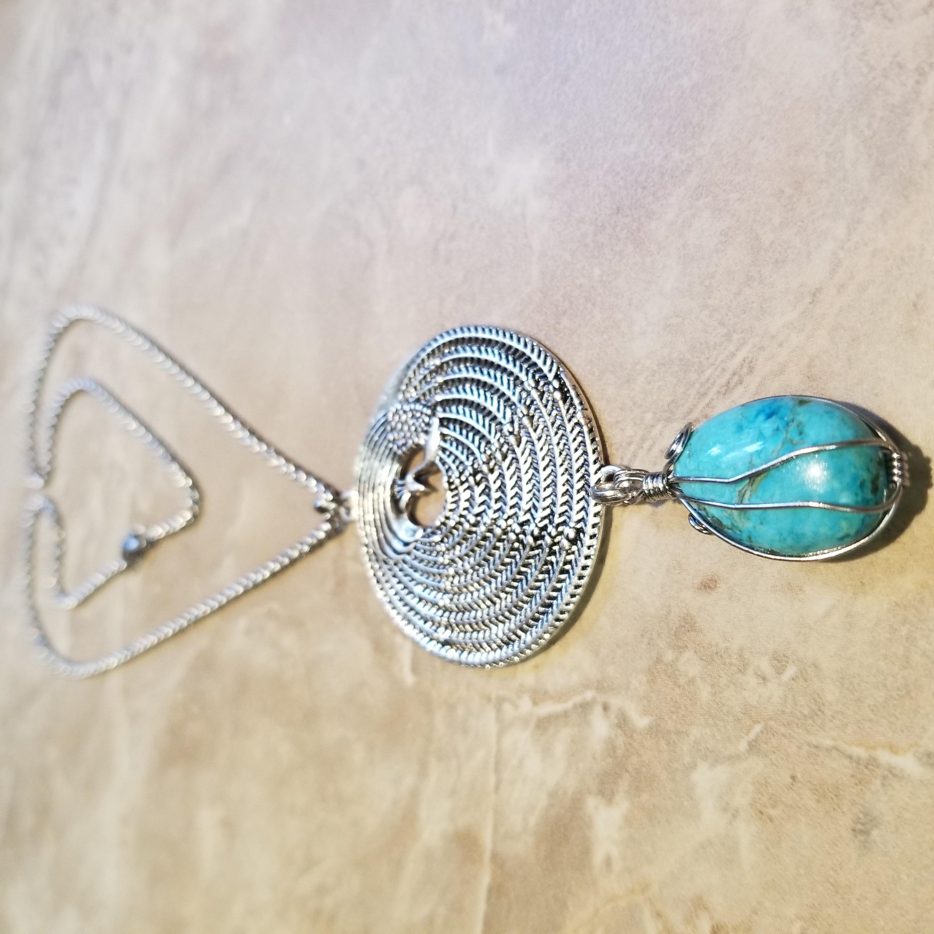 Silver-plated/finished peacock pendant necklace is wire-wrapped with Turquoise dangle and assembled on 18" silver-plated/finished delicate linked chain.