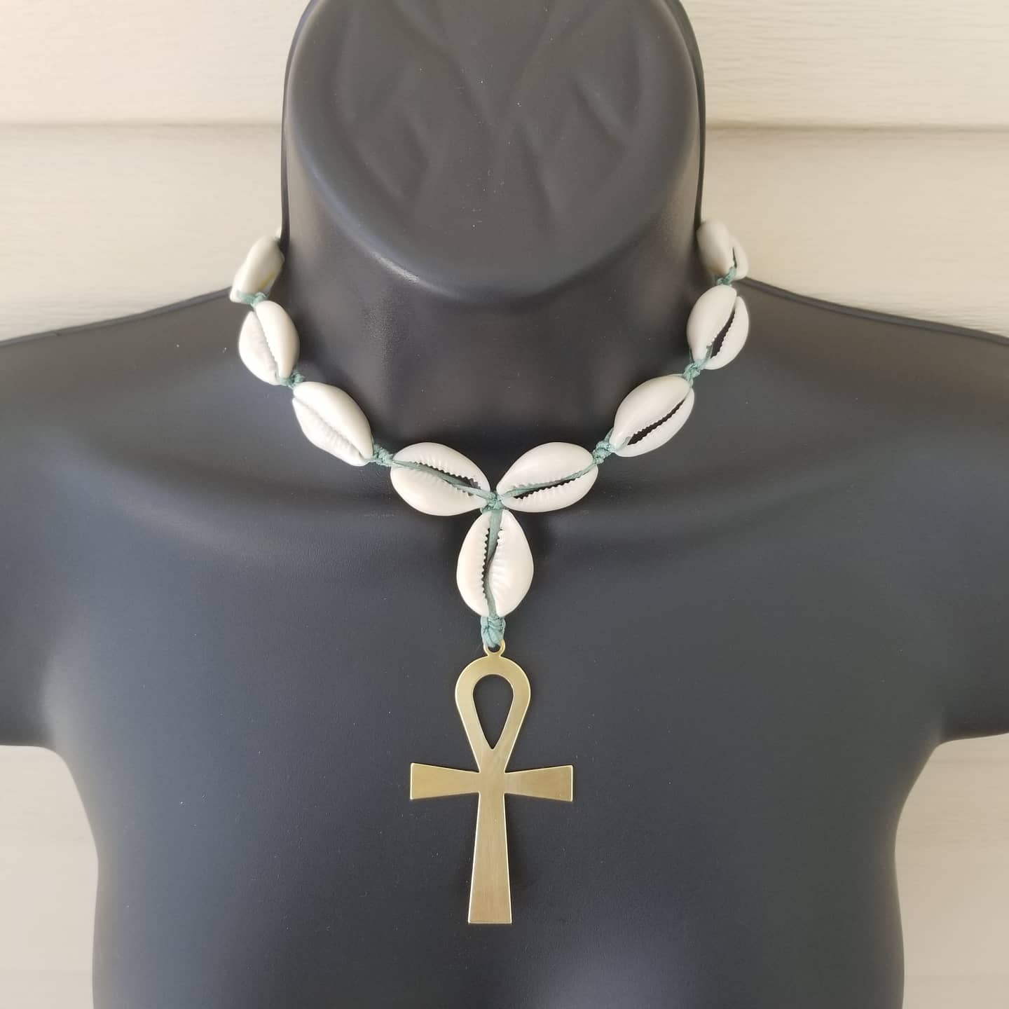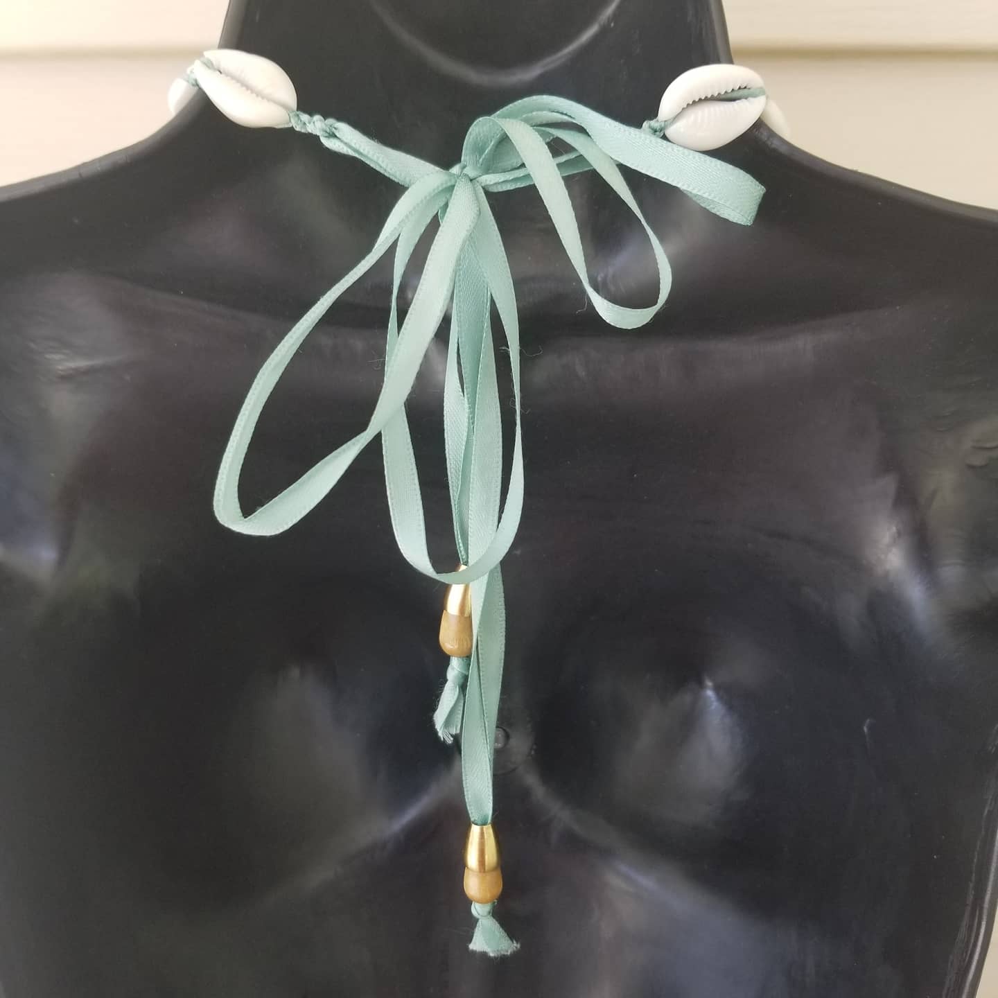 Tie-on necklace is made with brass pendant, natural cowrie shells, ribbon, and decorative beads.